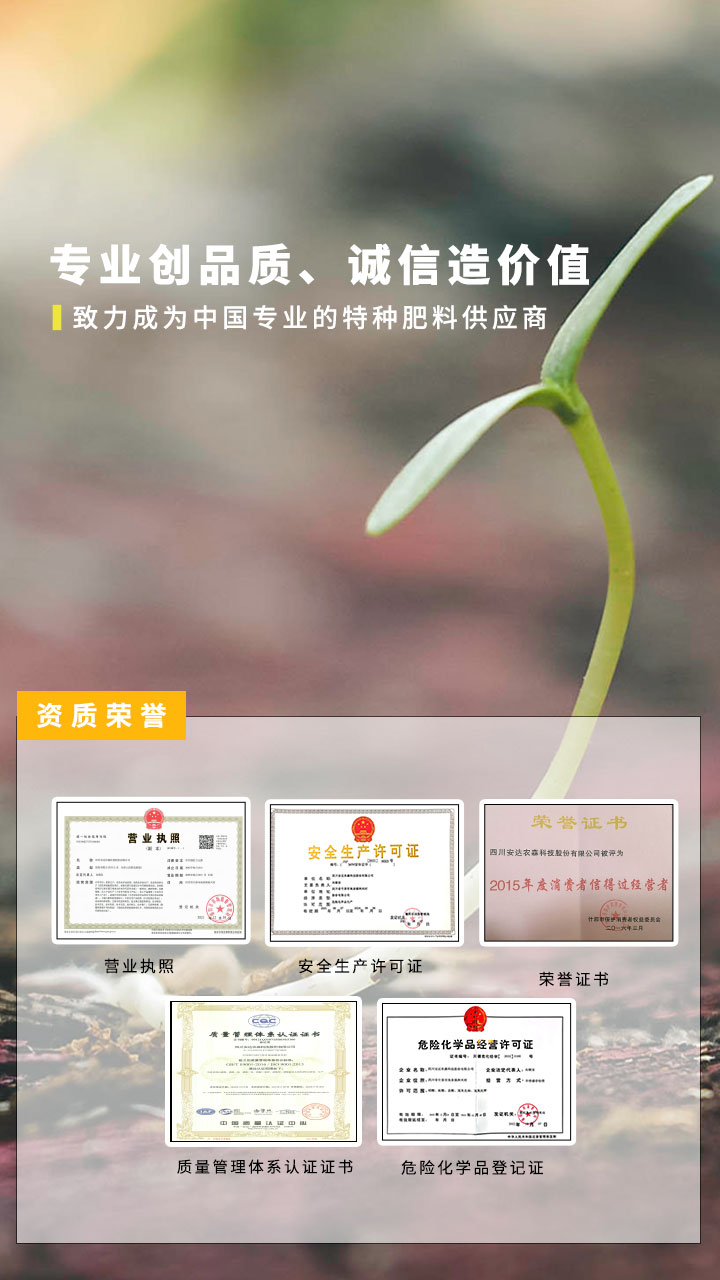 經(jīng)過二十余年的探索和實(shí)踐,依托自身技術(shù)和出口背景,按照國際市場規(guī)范培養(yǎng)了大批高素質(zhì)的專業(yè)化技術(shù)化團(tuán)隊(duì),掌握了水溶性肥料的核心技術(shù),擁有完善的研發(fā)中心、質(zhì)檢中心,目前已獲得多個(gè)國家專利技術(shù)。公司一直把“做中國專業(yè)的特種肥料供應(yīng)商”作為自身的發(fā)展使命。推廣高端植物營養(yǎng)與先進(jìn)技術(shù),高效施肥方式的綜合配套方案,減輕中國種植業(yè)勞動(dòng)強(qiáng)度,讓種植業(yè)效率更高、效果更強(qiáng)、效益更好!努力成為革新中國種植業(yè)生產(chǎn)方式的偉大公司!